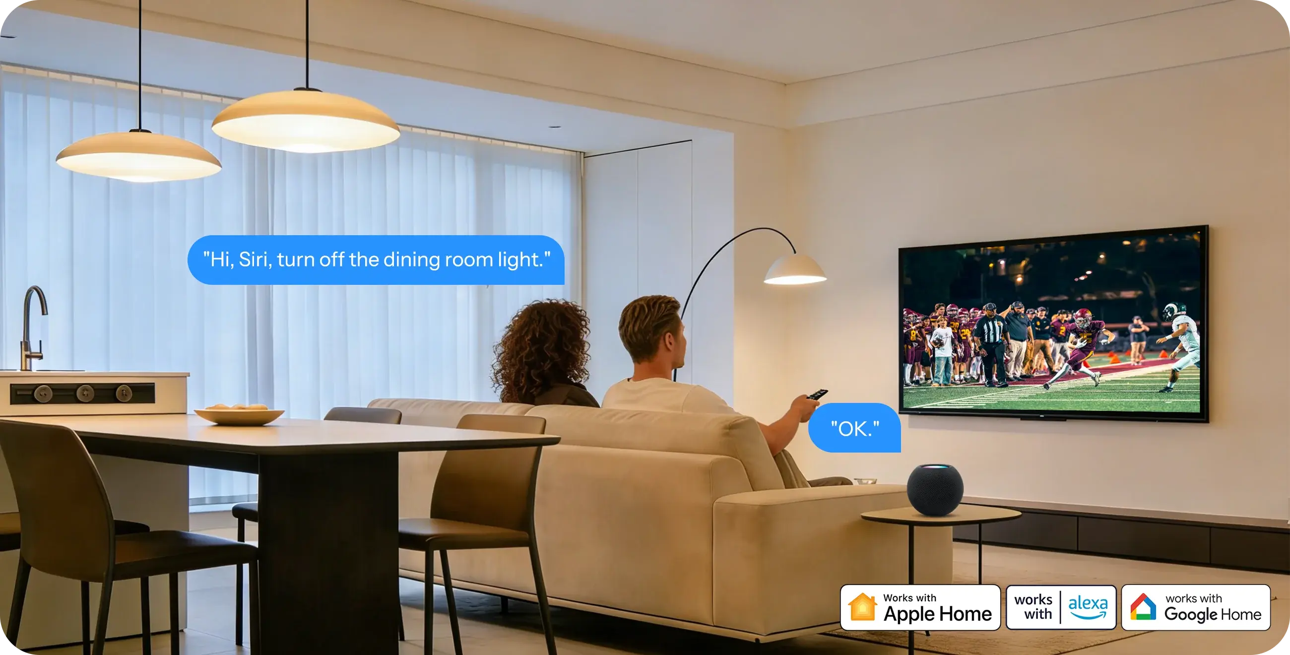 It works seamlessly with popular voice assistants like Amazon Alexa, Google Assistant, and Apple Siri Shortcuts,