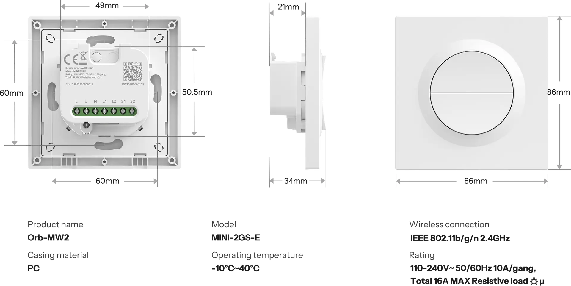 Orb-MW2 is a WiFi smart switch designed for flexible, reliable home control. With dual independently controlled channels, it manages two circuits simultaneously with a combined load of up to 16A. Built on the Matter protocol, it integrates seamlessly with Apple Home, Google Home, and Amazon Alexa for cross-platform control. Detach Relay Mode keeps smart and physical control independent, ensuring reliable operation even during network outages. App, voice, and automation support enable smarter, more responsive living.