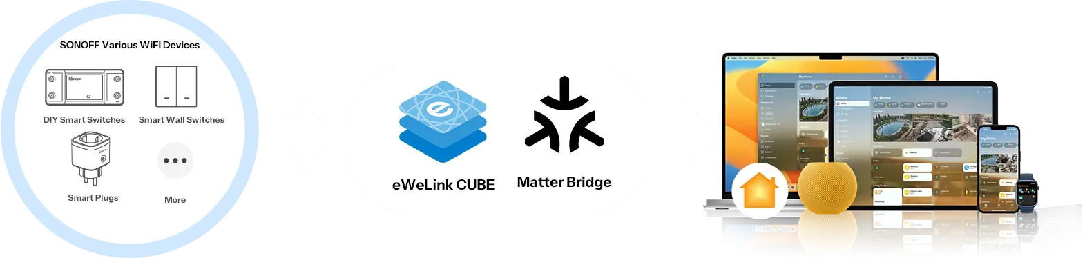 Seamlessly connect SONOFF WiFi devices to Matter via CUBE OS built-in Matter Bridge-- free, local, and ready for Apple Home, Google Home, Alexa, SmartThings, and Home Assistant.